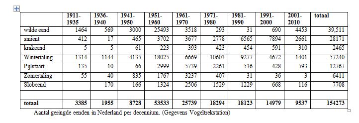In totaal zijn er in de periode 1952-2012 115.586 eenden geringd.
