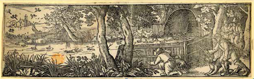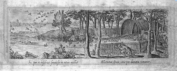 Gravure uit 1582 naar Hans Bol (let op de vergelijking met de oudste houtsnede) met een vangpijp langs de rivieroever met twee zwemmende honden. Het onderschrift luidt vertaald: “Zo wordt ook met listen de malse eend in de gebogen nettten gelokt, terwijl een hond door het struikgewas zwemt”