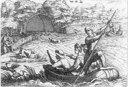 | Gravure uit 1621 door Victor Rijckelsma in zijn Wilde eendenjacht ofte beschrijvinge van de Hollandsche Vogelkoyen. Vertaling van het onderschrift: “ Wat kwaak je en maak je de kuif bol? Zie, Zo lokt de ene eend de andere in de val onder gesnap, en gaat haar listig voor met zijn voorbeeld en met bedrieglijk gesnater, totdat de honden de aangelokte onder hun ban hebben gebracht”.